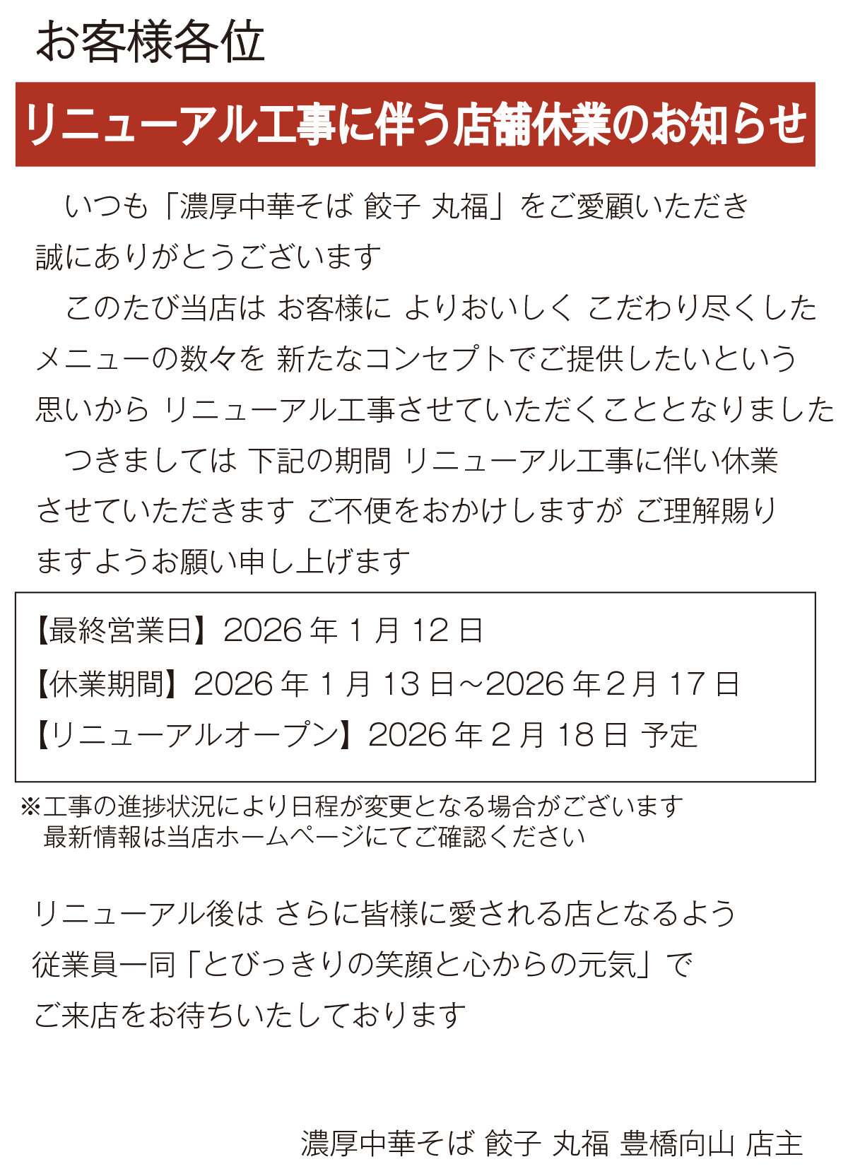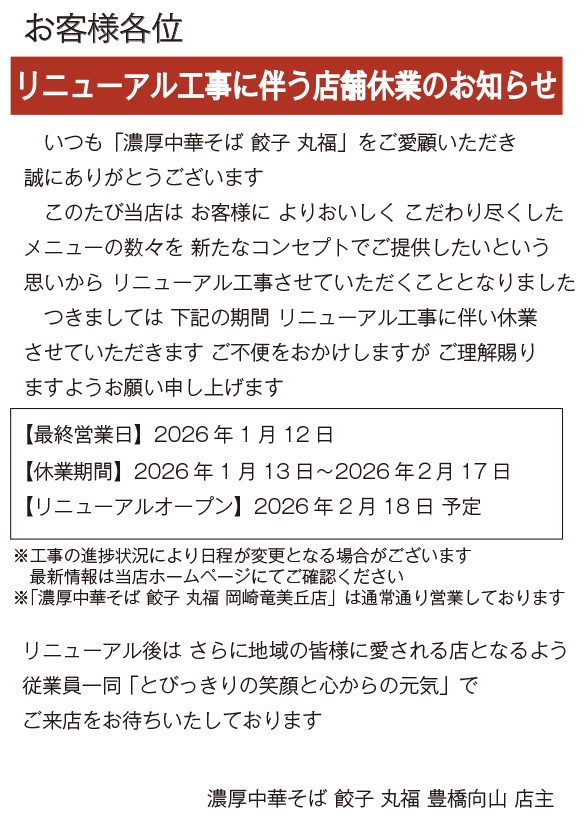 「濃厚中華そば 餃子 丸福 豊橋向山本店」リニューアル工事に伴う店舗休業のお知らせ